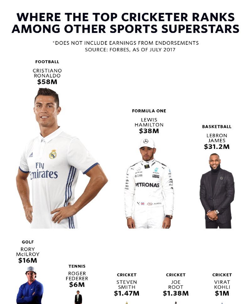 Kohli, along with Rohit Sharma, Jasprit Bumrah and Ravindra Jadeja are Class A+ cricketers in the Board of Control for Cricket in India (BCCI). Grade A+ cricketers are paid Rs 7 crore annually. All Indian cricketers who play international matches are paid per match separately. Kohli earns Rs 6 lakh per ODI, Rs 3 lakh per T20I and Rs 15 lakh per Test match respectively. However, this is not the highest salary in the world given to cricketers.