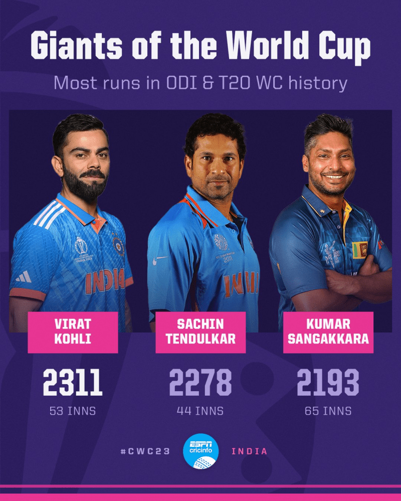 Playing in his 53rd World Cup tournament, Kohli surpassed Tendulkar’s tally of 2278 runs at a total average of over 60.