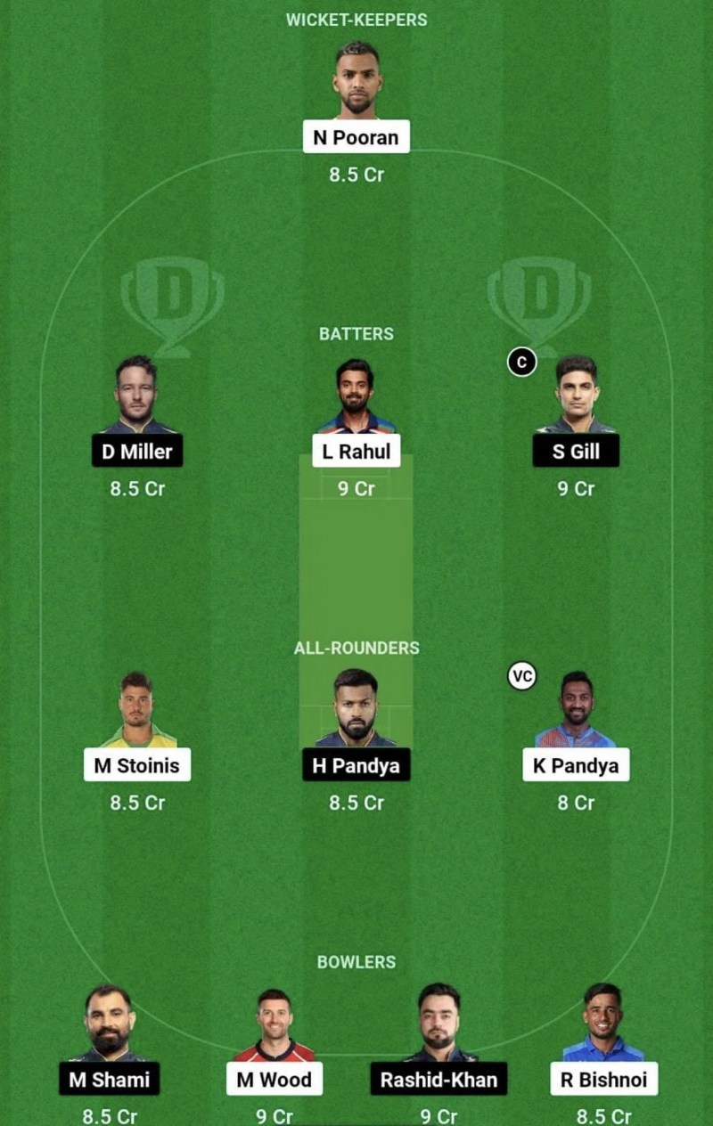 Gujarat Titans: Wriddhiman Saha/KS Bharat (WK), Shubman Gill, Kane Williamson, Hardik Pandya (C), Matthew Wade, Abhinav Manohar, Rahul Tewatia, Rashid Khan, Alzarri Joseph/Odean Smith, Mohammed Shami, R Sai Kishore