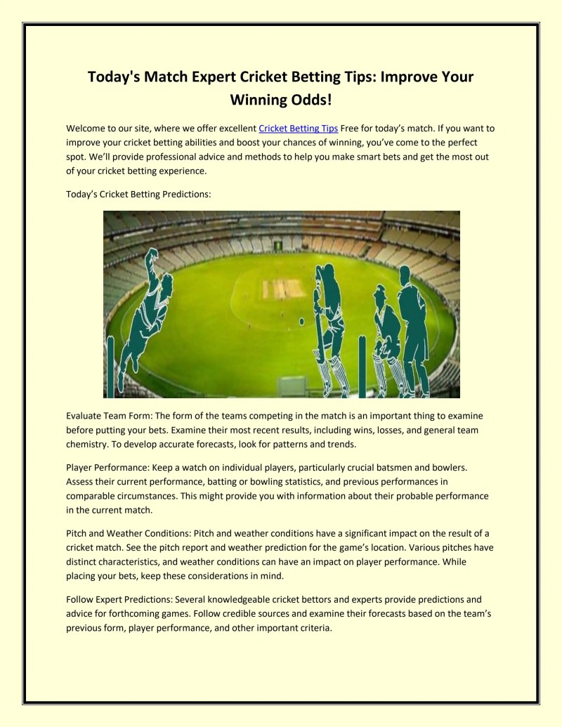 Get free match predictions, data-driven betting tips and live cricket match odds from our team of analytical experts. Provide information on betting value for international and domestic cricket events.