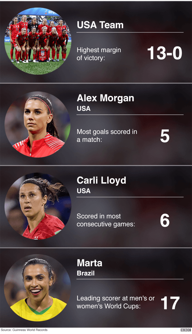 The US women’s soccer team won the FIFA Women’s World Cup in 1991, 1999, 2015 and 2019. They also scored the most goals (138) in the global showpiece.